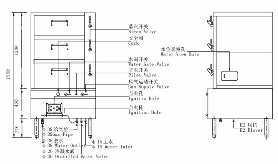 蒸柜炉由上柜体及下炉胆支架组成,上体采用全不锈钢组成,分为三层,上面两层每层内含不锈钢层网一件,下面一层含不锈钢层网两件,每格上有不锈钢掩门,门框上采用优质、卫生及耐高温密封条,防止蒸汽泄漏,每一格设有独立汽阀开关,自动排出过压蒸汽。下支架用40x40x4mm角铁并加涂防锈漆,水胆为5mm厚黑铁板,外封不锈钢板,使炉身外观优美并坚固。配置不锈钢自动供水水箱一个,点火棒一支。
