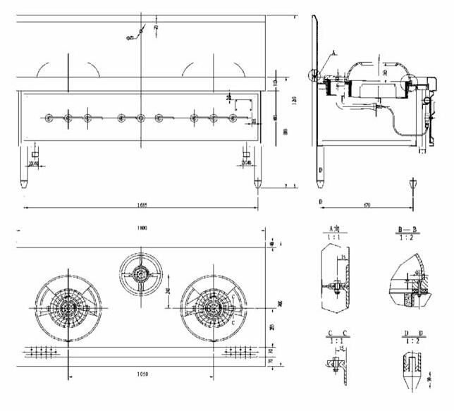 (2)炉外结构选用进口不锈钢板,上设优质摇摆水龙头,可配置炸筐架及不锈钢调料板,并可根据需要订做,可设计自然风式。