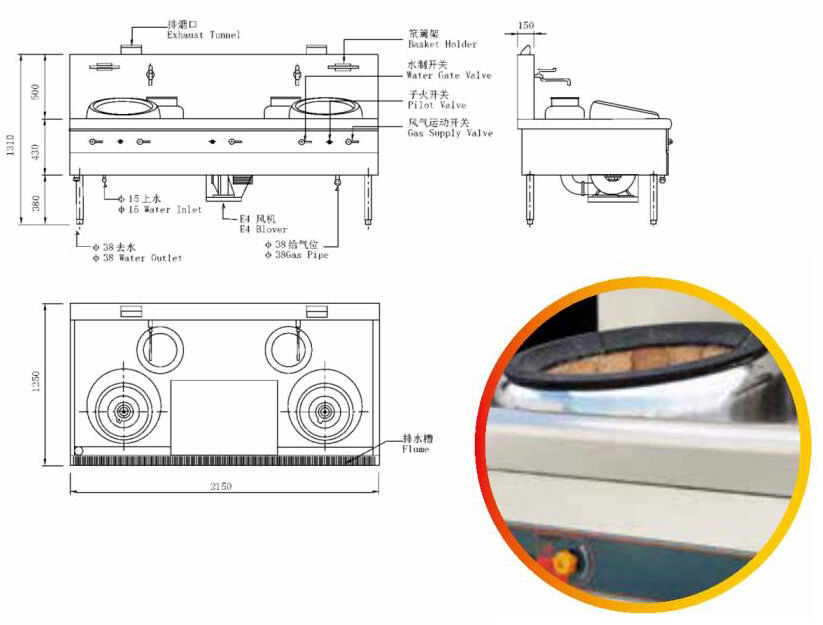 (3)可根据厨房现场订做其它异形款式及尺寸,分别配置制式点火棒或节能电子点火器。